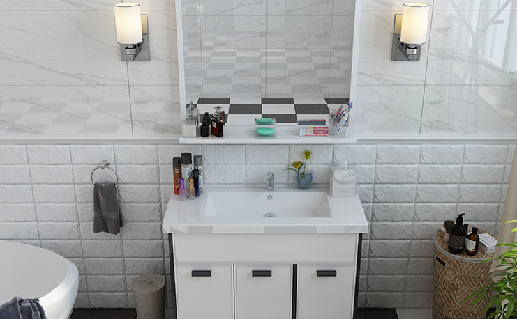 該衛(wèi)生間洗漱柜以更大面積的底柜設(shè)計(jì),專門來存儲(chǔ)各類衛(wèi)生間用具,避免了亂擺放的現(xiàn)象;同時(shí)采用規(guī)整的設(shè)計(jì)結(jié)構(gòu),保證使用洗漱臺(tái)的時(shí)候更方便省心。