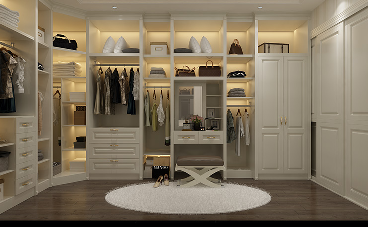 該一體梳妝臺(tái)采用簡歐風(fēng)格,融入整個(gè)衣帽間之中,既起到了裝飾性的效果,也方便人們的日常使用;整體布局錯(cuò)落有致,空間保留完整,基本符合現(xiàn)在人們對(duì)于梳妝臺(tái)的要求。