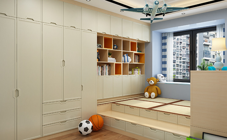 多元組合臺階式榻榻米整合了衣柜、書柜、書桌、儲物柜等多種存儲空間,帶來更多樣的裝飾家居。簡約的設(shè)計(jì)風(fēng)格,帶來清新之感。