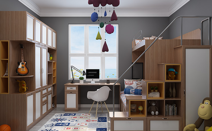 該兒童臥室榻榻米采用上下雙人床設(shè)計(jì),更添活潑之氣;臺(tái)階以開(kāi)放柜打造而成,既可裝飾又兼實(shí)用。柜板以兩種顏色噴涂,帶來(lái)雙重疊加之感,設(shè)計(jì)感倍增。
