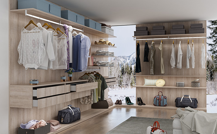 該墻壁衣柜多適用于較大的房子,可擺放或掛放多類衣物。整體落地設(shè)計(jì),橫桿錯(cuò)落更具設(shè)計(jì)性,同時(shí)做抽屜柜隔斷,在增加存儲(chǔ)空間的同時(shí),亦可增加設(shè)計(jì)感。