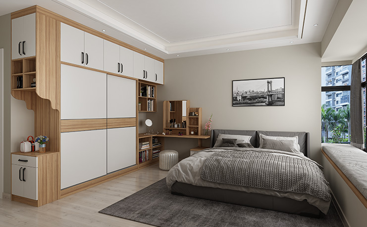 該組合衣柜以白色和原木色系為主要搭配,創(chuàng)作出更加簡潔的衣柜產(chǎn)品。在空間布局設(shè)計上,除了衣物的儲物空間之外,還和簡易書柜以及展示柜進行搭配,既是延伸了設(shè)計風格,同時也擴大的存儲空間。