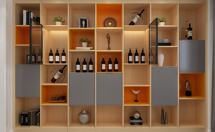 純木紋設(shè)計(jì),簡(jiǎn)約卻不失個(gè)性,跳脫的橘色更是映襯出了創(chuàng)意酒柜的獨(dú)樹(shù)一幟。方格空間設(shè)計(jì),擺放更加隨意,各種裝飾品也可陳列其中。