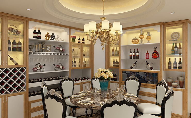 歐式轉(zhuǎn)角酒柜擺放在客餐廳之中,既可以存儲(chǔ)不同類型的酒類,還能夠起到裝飾性的作用,一舉多得,半開放的柜式,方便存取,提供空間利用率。