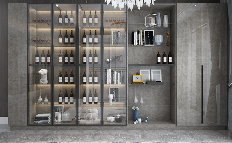 灰色系設(shè)計(jì)歷來(lái)是輕奢格調(diào)的主色,此落地酒柜還搭配玻璃透明,突出展示裝飾的同時(shí),還可增加更多的存儲(chǔ)空間,簡(jiǎn)約商務(wù)的設(shè)計(jì),凸顯空間的大氣,給整體空間帶來(lái)更別樣的裝飾。